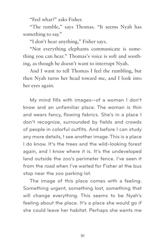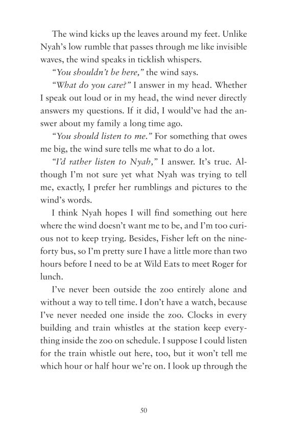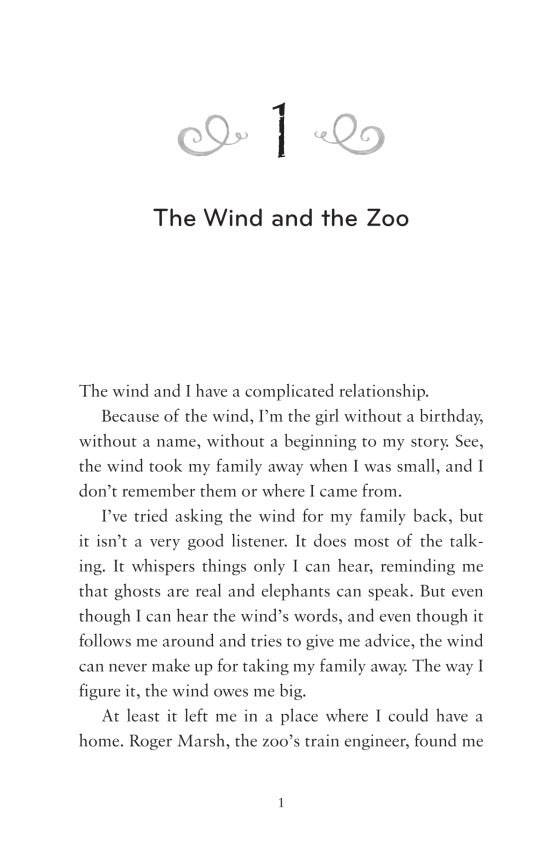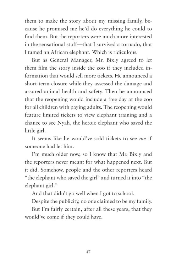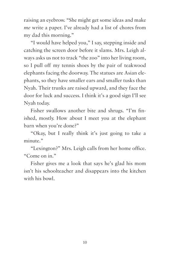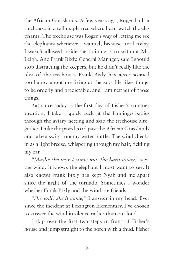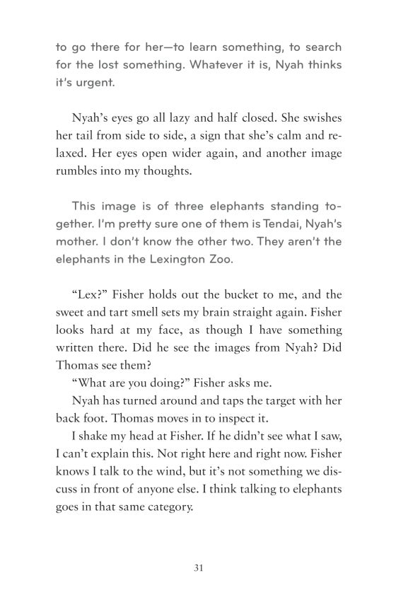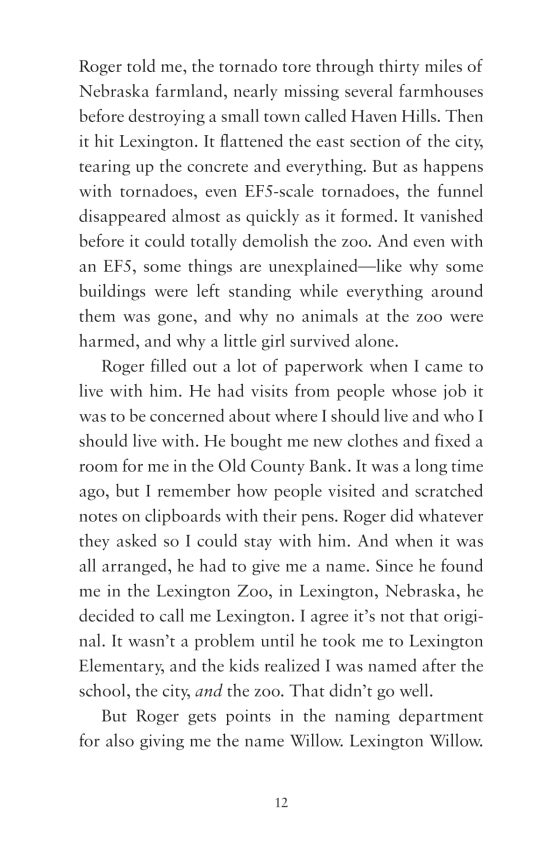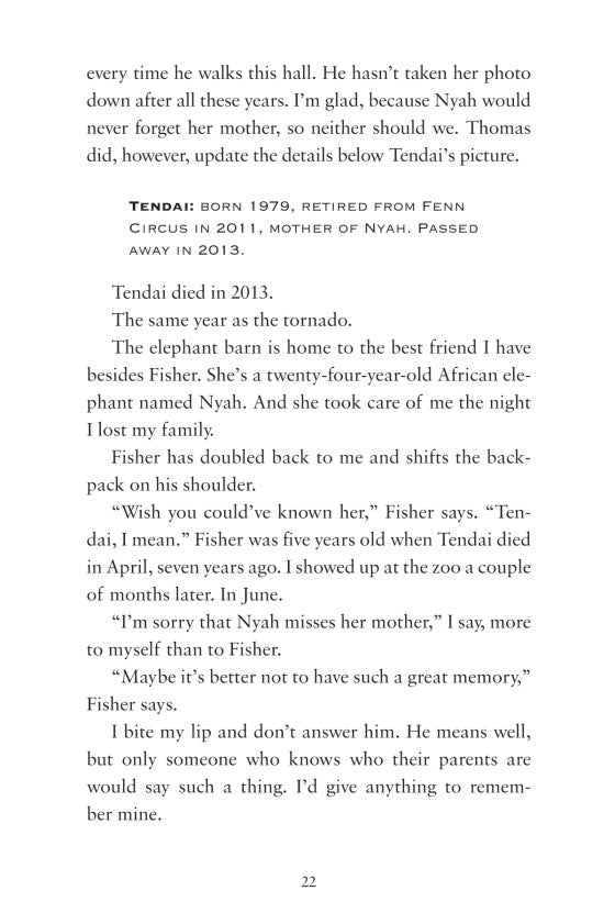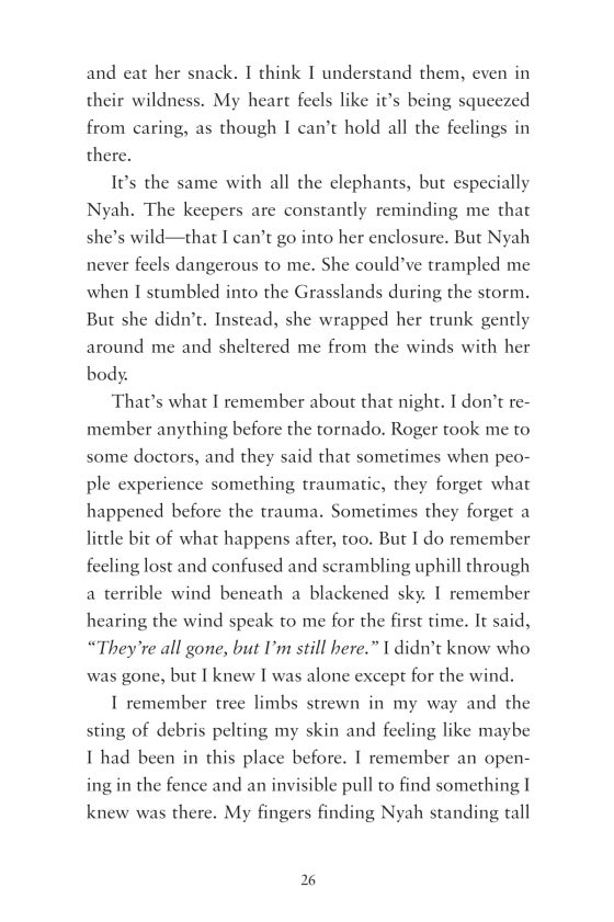 An elephant never forgets, but Lexington Willow can't remember her past. Swept away by a tornado as a toddler, she was dropped in a nearby Nebraska zoo, where an elephant named Nyah protected her from the storm. With no trace of her family, Lex grew up at the zoo with her foster father, Roger; her best friend, Fisher; and the wind whispering in her ear.