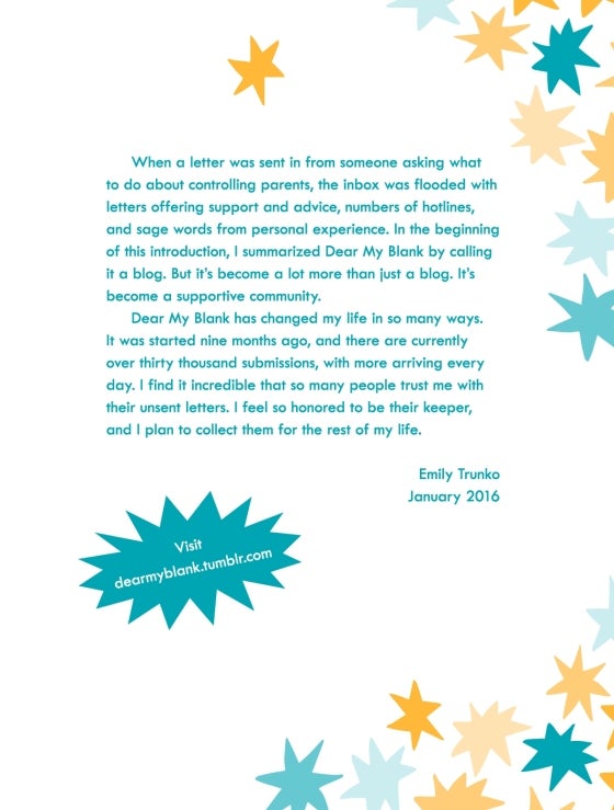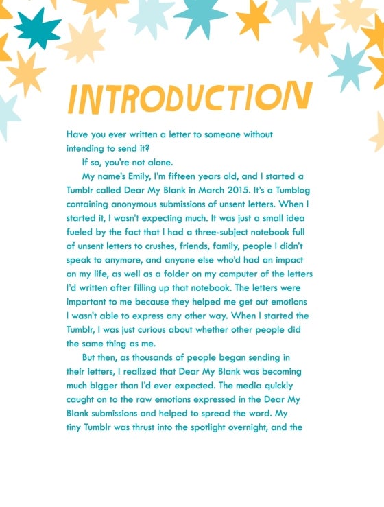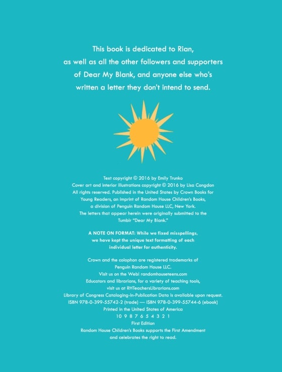 Look inside! Dear My Blank Secret Letters Never Sent Author Emily Trunko Illustrated by Lisa Congdon Buy! Dear My Blank select book format Ebook Amazon Apple Books Barnes & Noble Books A Million Google Play Kobo For Ages 14 to – 99 Under the Cover