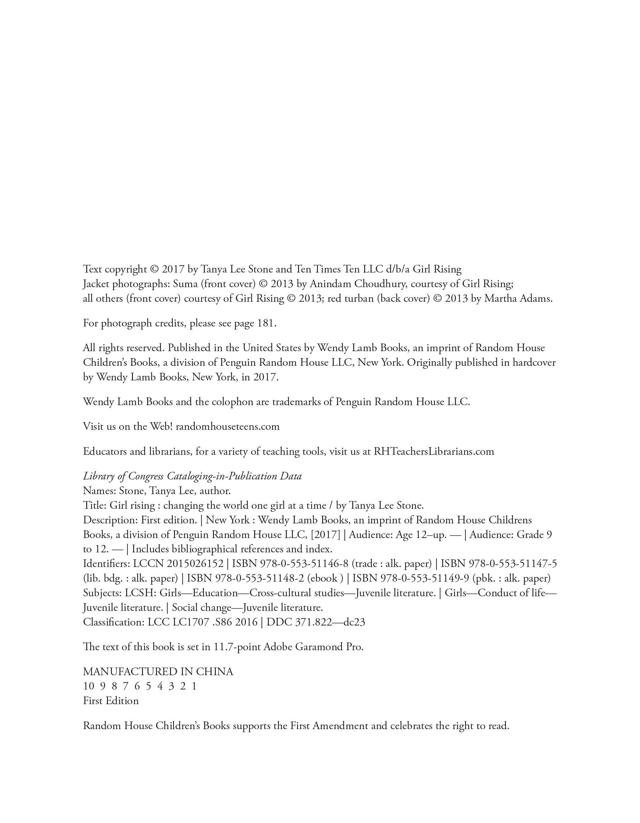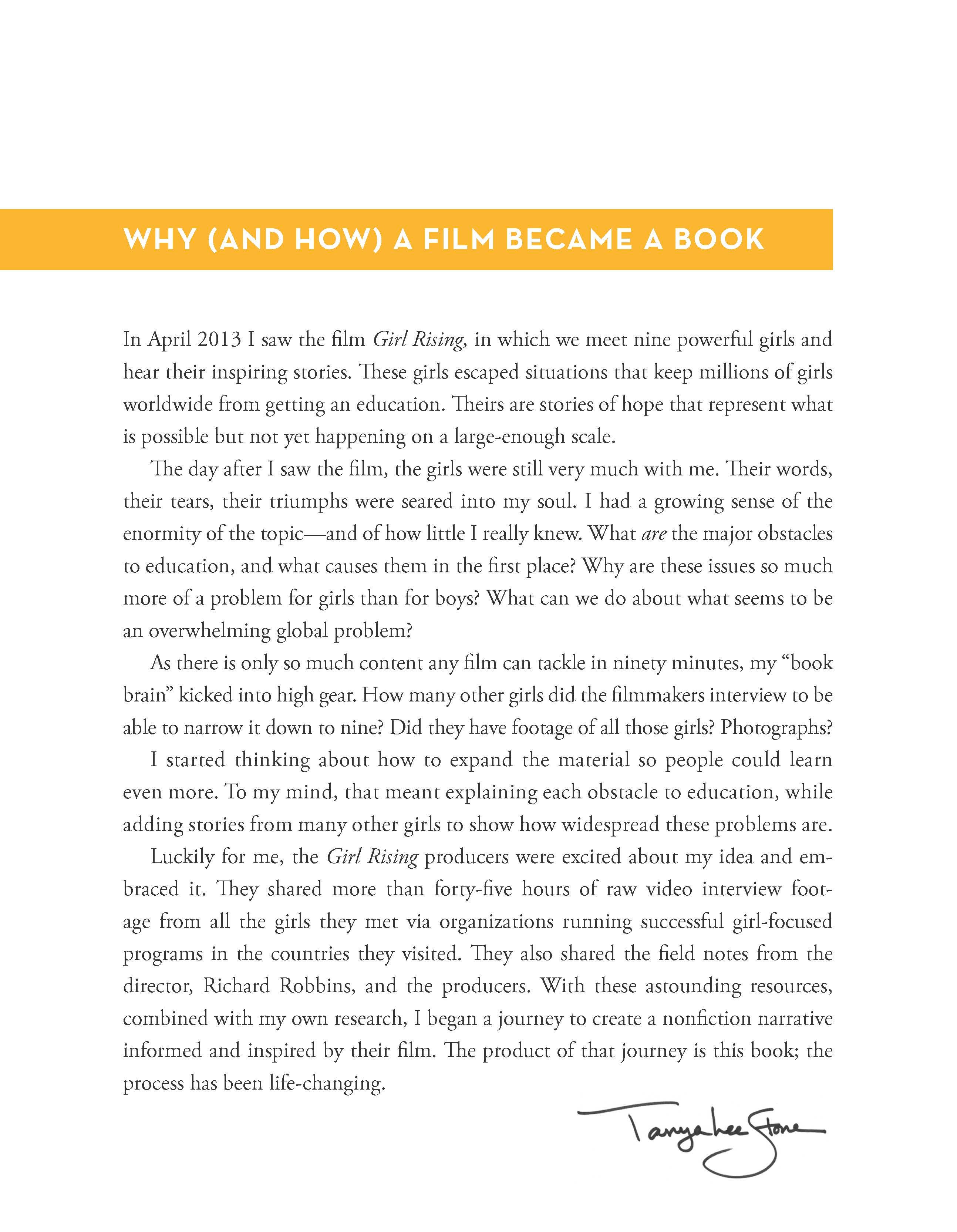 Look inside! Girl Rising Changing the World One Girl at a Time Author Tanya Lee Stone Buy! Girl Rising select book format Paperback Ebook Amazon Barnes & Noble Books A Million Bookshop.org Hudson Booksellers Powell's Target Walmart Amazon Apple Books Barnes & Noble Books A Million Google Play Kobo For Ages 14 to – 99 Under the Cover